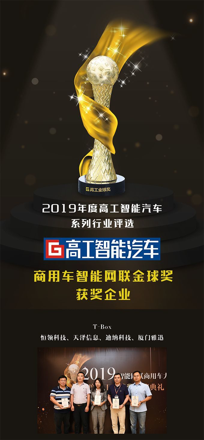2019年9月20日,2019年度GGAI智能網(wǎng)聯(lián)商用車金球獎評選頒獎典禮在武漢召開。恒領(lǐng)科技喜獲2019智能網(wǎng)聯(lián)商用車“T-box年度供應(yīng)商”金球獎。